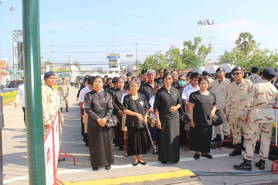 เวลา ๑๖.๓๐ นาฬิกา ข้าราชการในชุดปกติขาวไว้ทุกข์ ตั้งแถวขบวนรอรับ ไฟหลวงพระราชทาน นายอนันต์ นาคนิยม นายอำเภอเมือง จังหวัดสุพรรณบุรี นำไฟหลวงพระราชทาน ขึ้นประดิษฐานเบื้องหน้าพระบรมฉายาลักษณ์ พระบาทสมเด็จพระปรมินทรมหาภูมิพลอดุลยเดช บรมนาถบพิตร ณ พระเมรุมาศจำลอง และ ซุ้มถวายดอกไม้จันทน์ วัดป่าเลไลยก์วรวิหารจังหวัดสุพรรณบุรี